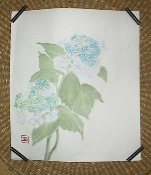 私は紫陽花が大好きです。雨にぬれ、雨上がりの色の鮮やかな紫陽花にはいろいろと楽しい思い出があります。うす紫、水色、ピンク、白等と美しい花は心をなぐさめてくれます。このガクアジサイは知人のお庭に咲いていたのを頂きまして描きましたが、とても難しくて困りました。