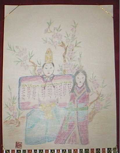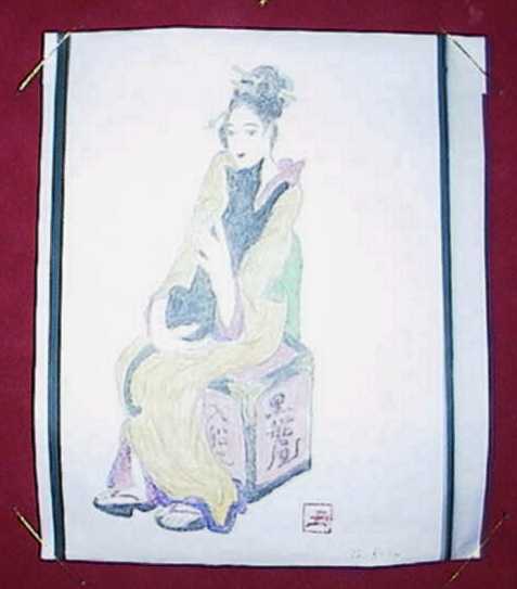 私は竹下夢二先生の絵は大好きです。なかなかお逢い出来ませんでしたが、図書館から借りて来て頂いて、三日間でしたので、絵とにらめっこして描きました。人物画は描いたことがありません。その上右手の具合が悪いですから一寸ためらいましたが、思い切って描きました。夢二先生の代表的な絵ですが出来上がってとても嬉しかったです。夢二先生一寸似てないよと笑っていらっしゃるかも知れませんね。